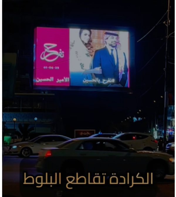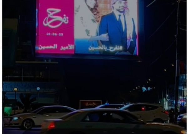 وعلقت مبادرات عراقية ، شاشات عرض في شوارع بغداد تهنئ ولي العهد والأردنيين، بمناسبة الزفاف الملكي، ويافطات تحمل وسم “نفرح بالحسين”.