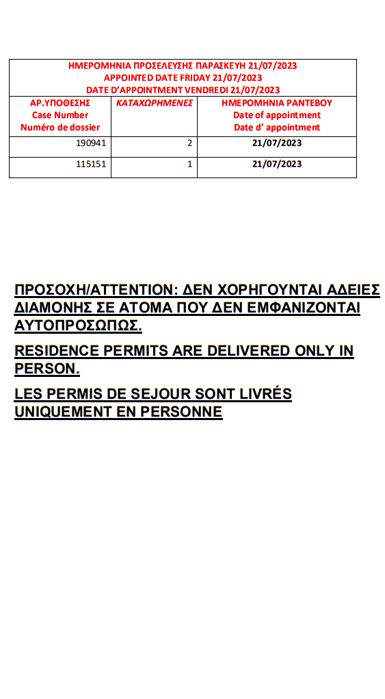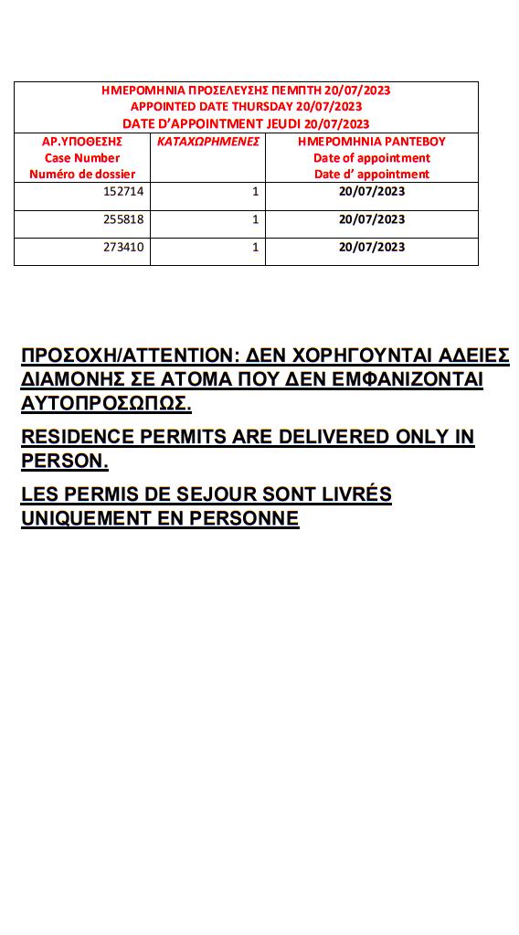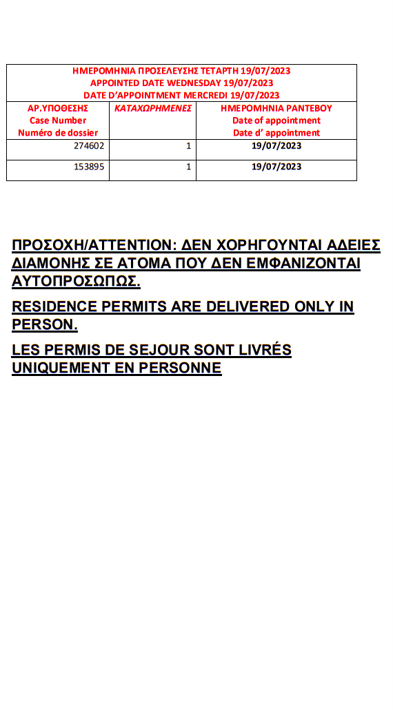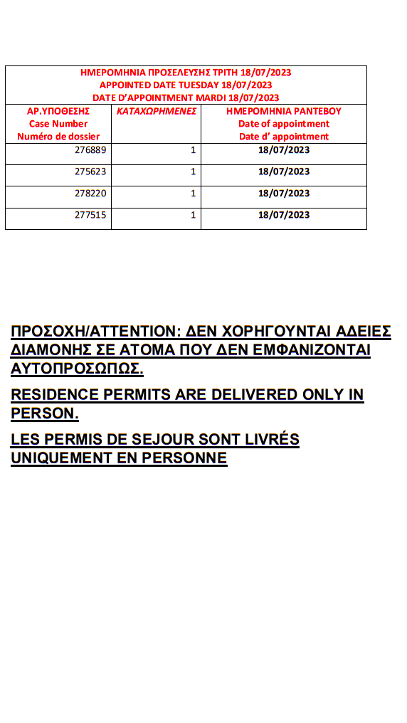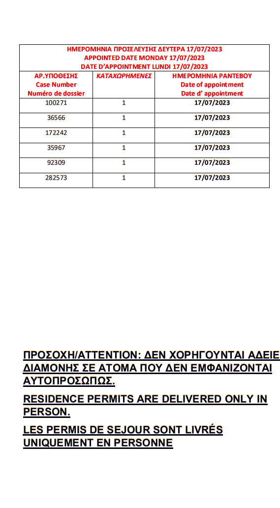 أصدرت وزارة الهجرة اليونانية في مدينة ثيسالونيكي الإقامات الجاهزة الخاصة بحالات اللجوء بتاريخ 12 يوليو 2023، على أن يتم تسليم الإقامات أيام 17 و18 و19 و20 و21 يوليو.