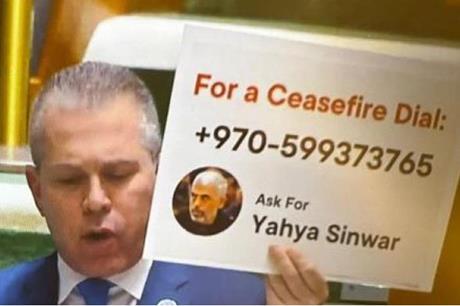 وكان المندوب الإسرائيلي لدى الأمم المتحدة رفع لافتة عليها صورة السنوار ورقم هاتف قال إنه يعود له خلال جلسة للجميعة العامة في نيويورك.
