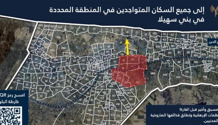 وقال المتحدث باسم الجيش الإسرائيلي أفيخاي أدرعي في بيان: إلى جميع سكان قطاع غزة المتواجدين في المنطقة المحددة في بني سهيلا، هذا إنذار مسبق وأخير قبل الغارة!”.