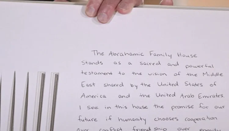 وكتب ترامب في سجل الزوار: “إن بيت العائلة الإبراهيمية يقف كشهادة مقدسة وقوية على الرؤية المشتركة بين أمريكا والإمارات للشرق الأوسط”، مضيفًا: “أرى في هذا البيت الوعد لمستقبلنا إذا اختارت البشرية التعاون بدلاً من الصراع، والصداقة بدلاً من العداوة، والازدهار بدلاً من الفقر، والأمل بدلاً من اليأس”.