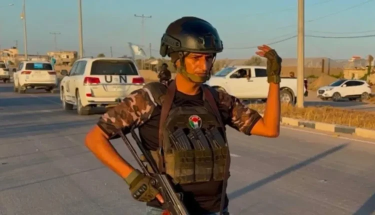 وكالة الناس – يظهر الصورة رجلاً نحيفاً أسمر البشرة يرتدي خوذة داكنة. يُمسك ببندقية، وتتحرك خلفه مركبات الأمم المتحدة وهو يُلوّح بيده عبر حركة المرور.