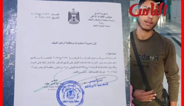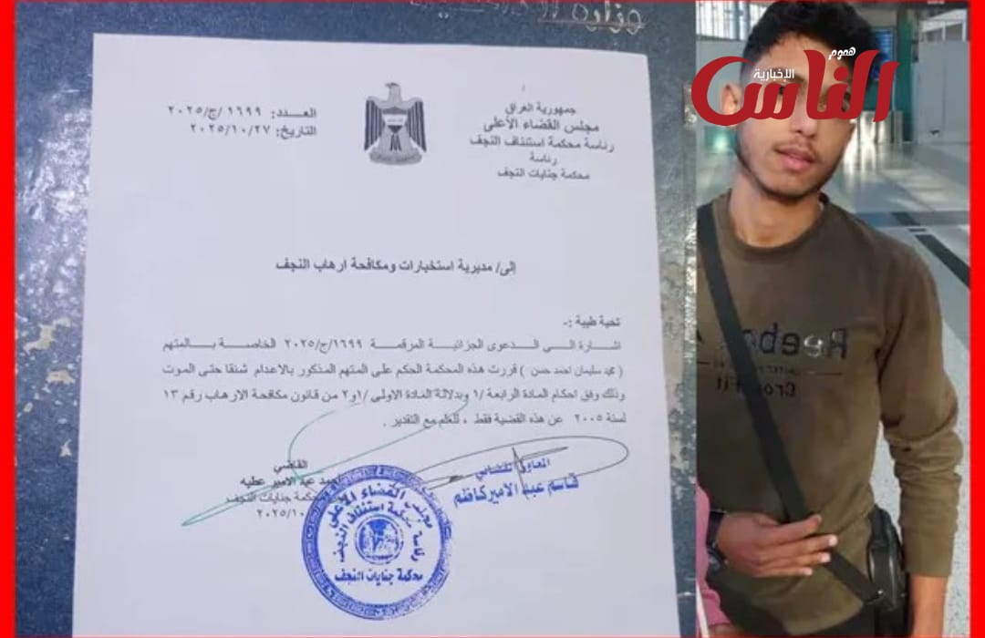 وكالة الناس -تداول ناشطون سوريون على مواقع التواصل الاجتماعي وثيقة قيل إنها صادرة عن محكمة النجف في العراق، تتضمن حكماً بالإعدام على الشاب السوري محمد سليمان أحمد حسن (22 عاماً) من محافظة حمص، وذلك بعد اعتقاله بتهمة نشر مقطع فيديو على “فيسبوك” يظهر فيه الرئيس السوري أحمد الشرع.