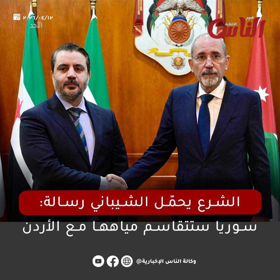 وكالة الناس – كشفت وزارة الخارجية السورية ان رئيس الجمهورية أحمد الشرع حمل وزير الخارجية أسعد الشيباني إلى المملكة الاردنية الهاشمية مفادها أنّ سوريا ستتقاسم مياهها مع الأردن.